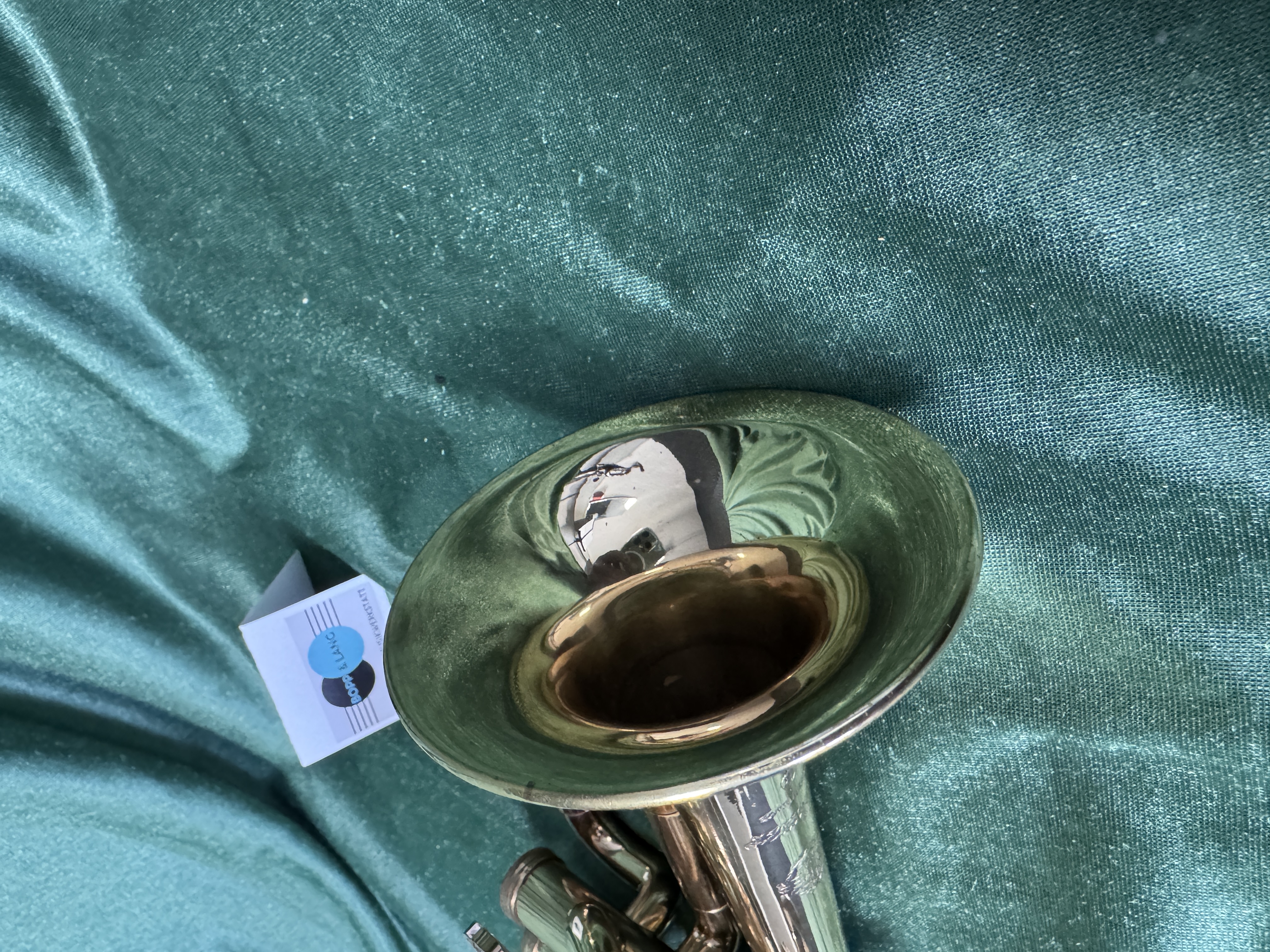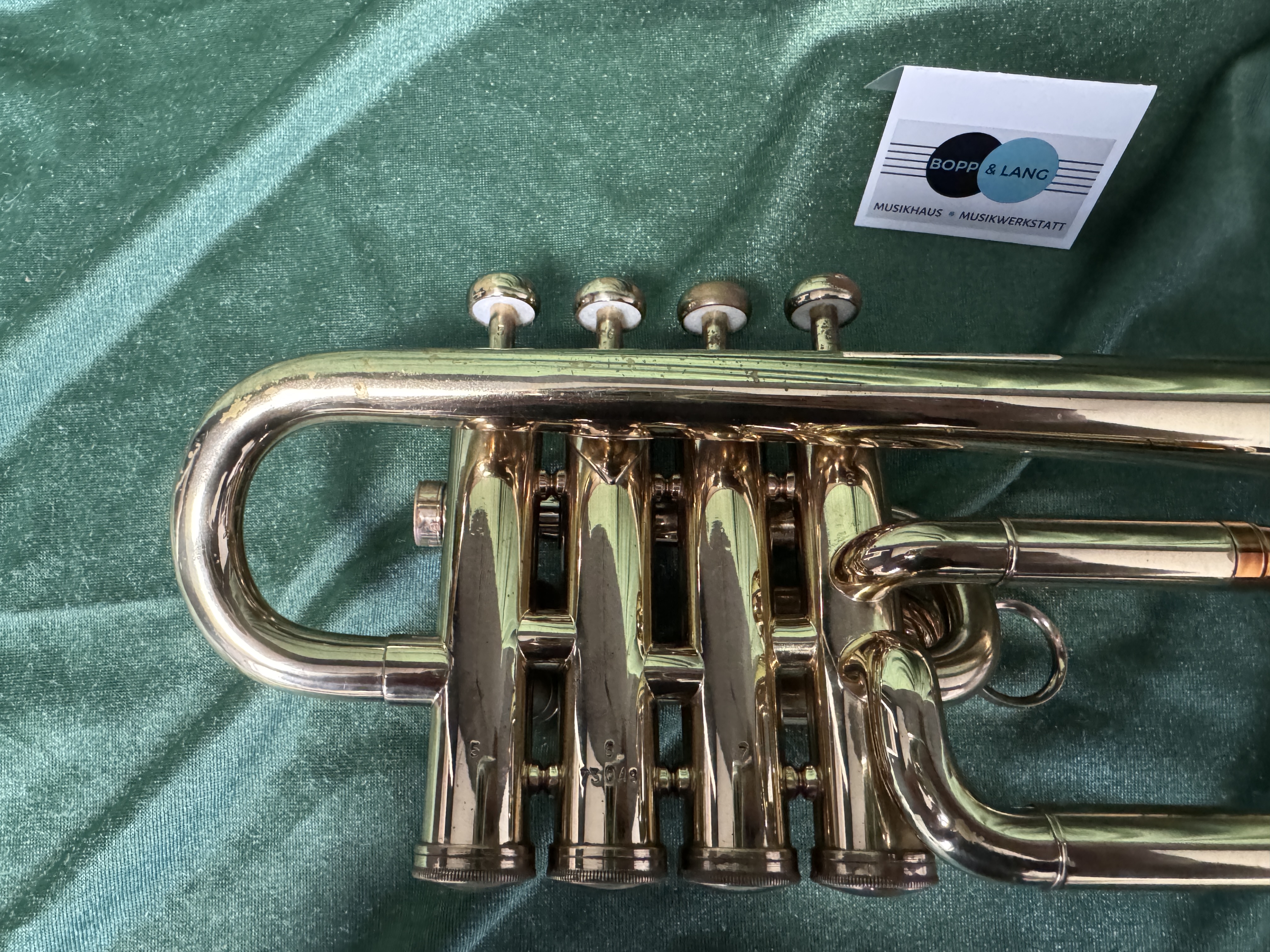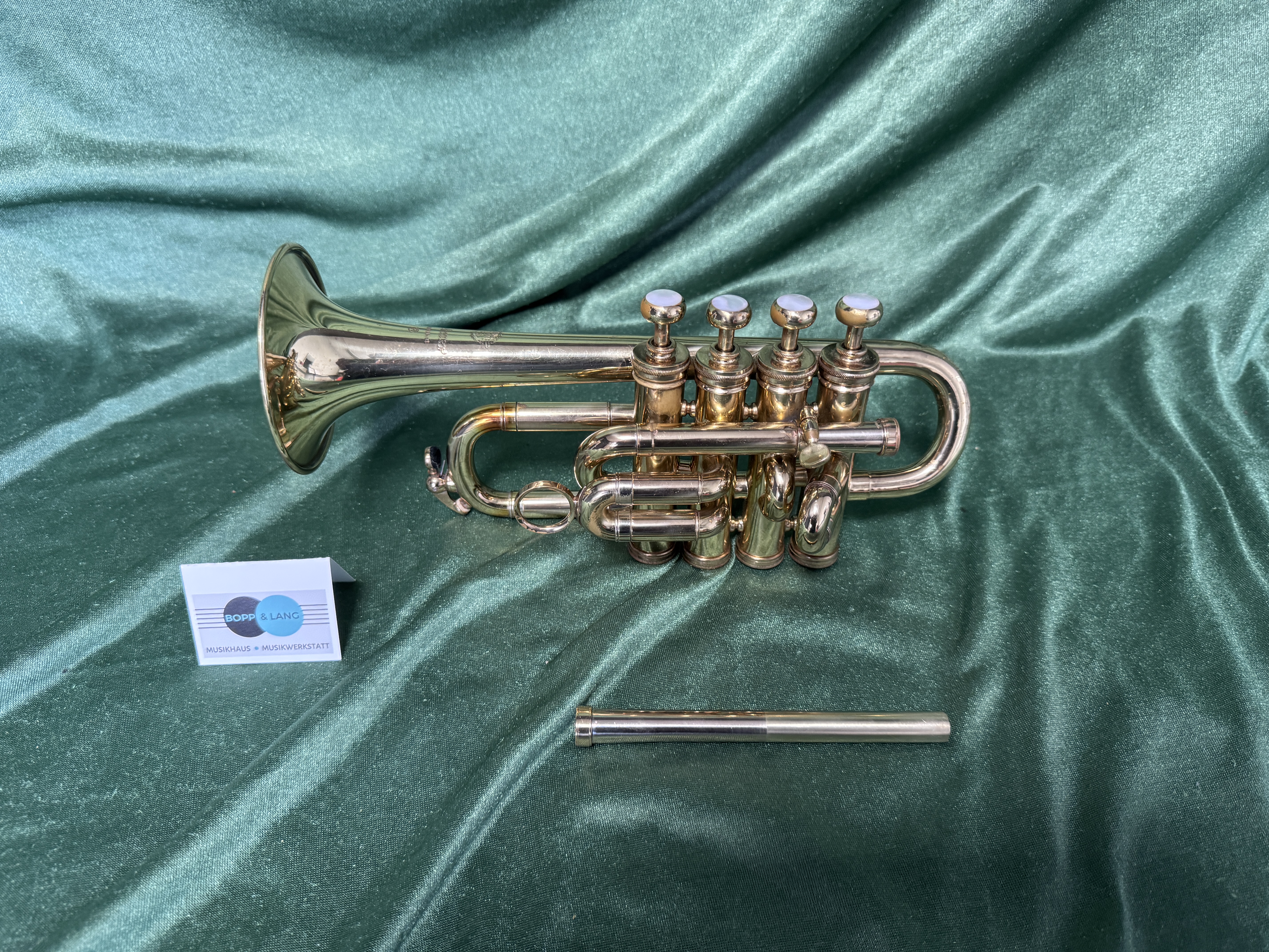 Das Instrument befindet sich bis auf kleinere Kratzer im guten Original Zustand. Der 4. Ventilzugbogen wurde in der Vergangenheit herausgelötet, deshalb ist der Lack an den Zwingen etwas dunkel, ebenso wurde der Schallstückbogen am Übergang vom geraden Teil zum Bogen ausgebeult. Wir haben das Instrument komplett zerlegt und gereinigt, Zugflächen aufpoliert, sowie alle Filze und Korken erneuert.